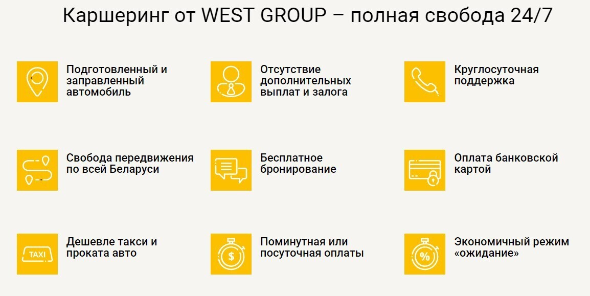 Компания берет на себя все пункты по обслуживанию авто, делая поездку клиента просто комфортной, — незачем думать о пробеге, техническом обслуживании, прохождении технического осмотра, оплате налогов на дороги и далее. Клиент не платит за топливо: все расходы West Group берет на себя. В каждом автомобиле есть карточка для заправки на определенных АЗС — в приложении клиент увидит ближайшие к нему заправки. Клиент не платит за мойку: автомобили обслуживаются в течение дня менеджерами компании. К тому же все автомобили West Group уже застрахованы по автоКАСКО.