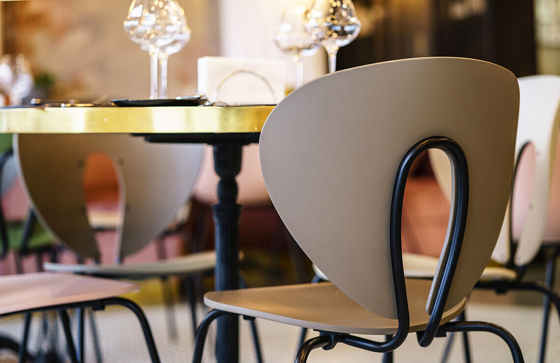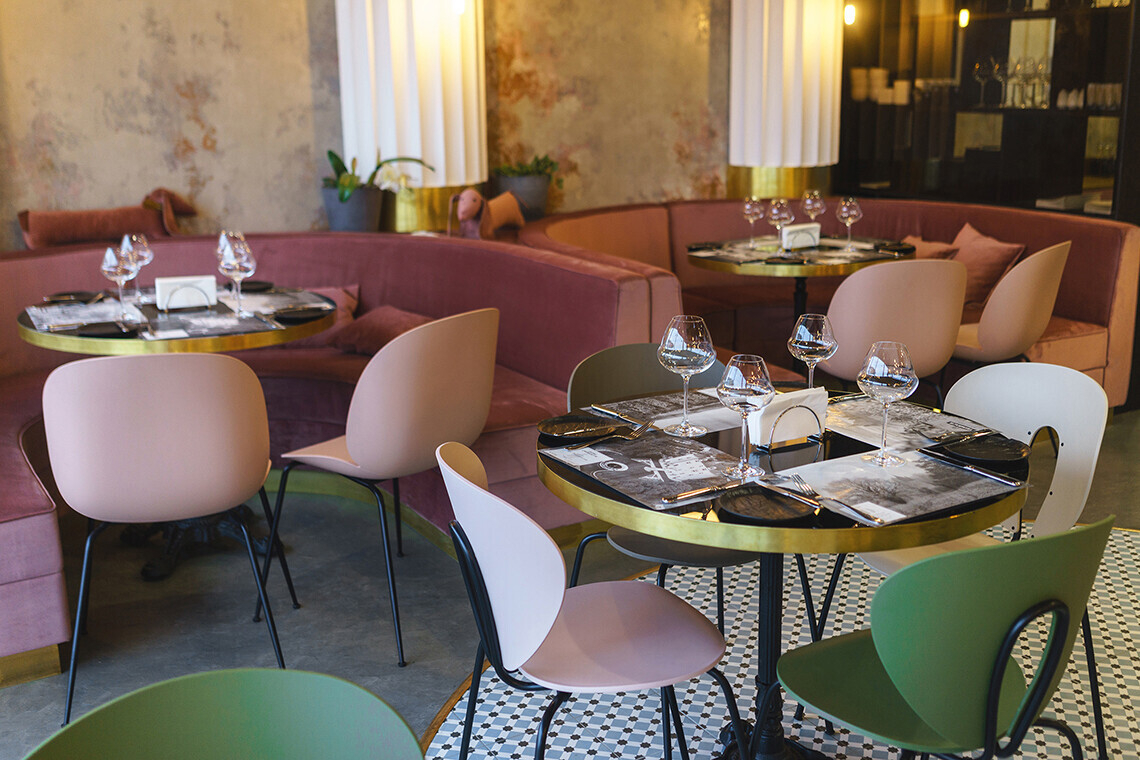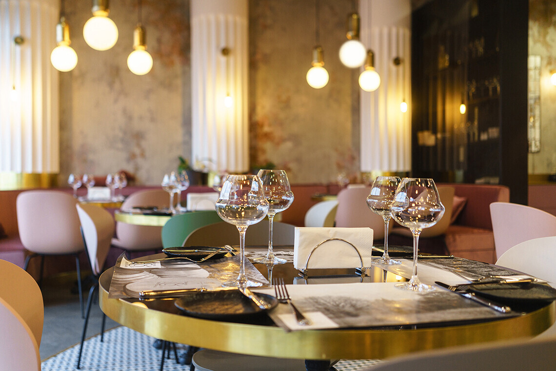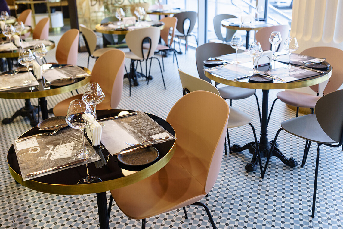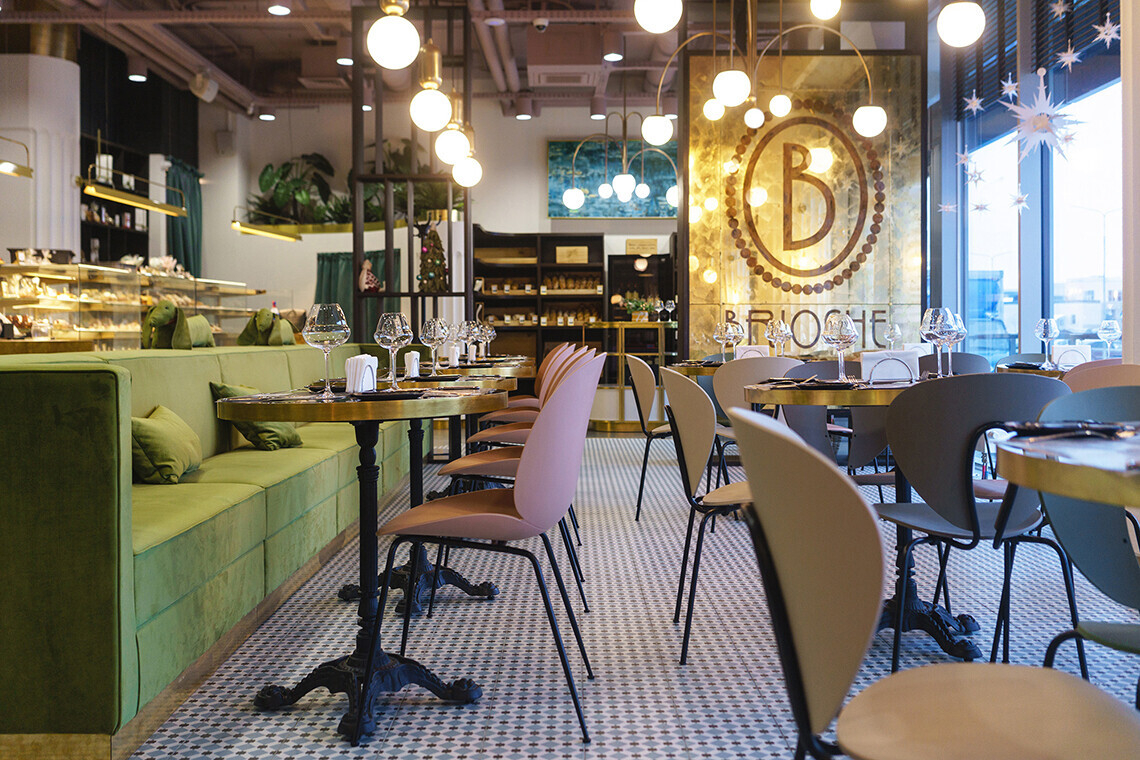 Интерьер Brioche Bistro состоит из огромного количества деталей, которые трудно рассмотреть с первого посещения. Это состаренные фактуры стен, рельефные колонны, столы с фигурными ножками и геометрическая плитка. Бистро всегда залито естественным светом благодаря большим панорамным окнам.