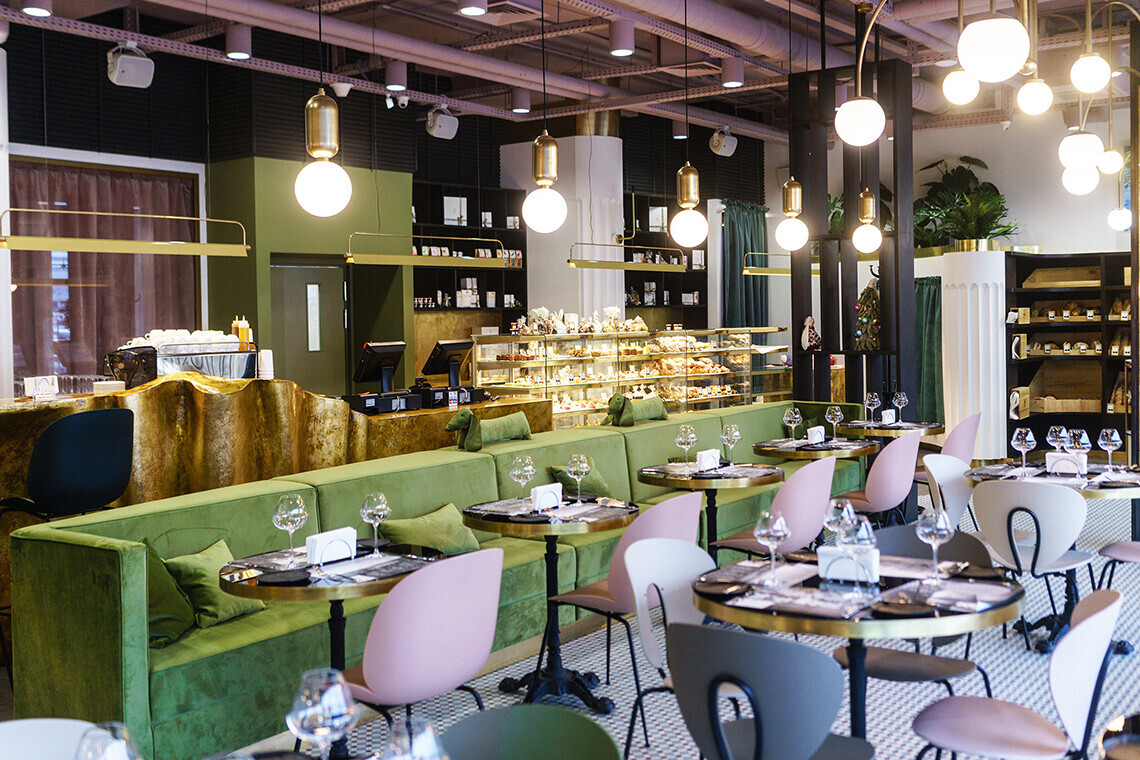 Интерьер Brioche Bistro состоит из огромного количества деталей, которые трудно рассмотреть с первого посещения. Это состаренные фактуры стен, рельефные колонны, столы с фигурными ножками и геометрическая плитка. Бистро всегда залито естественным светом благодаря большим панорамным окнам.