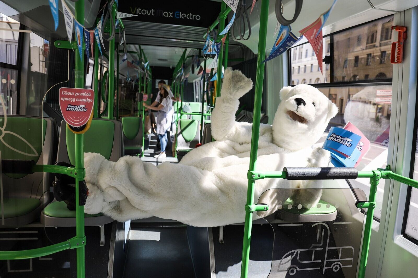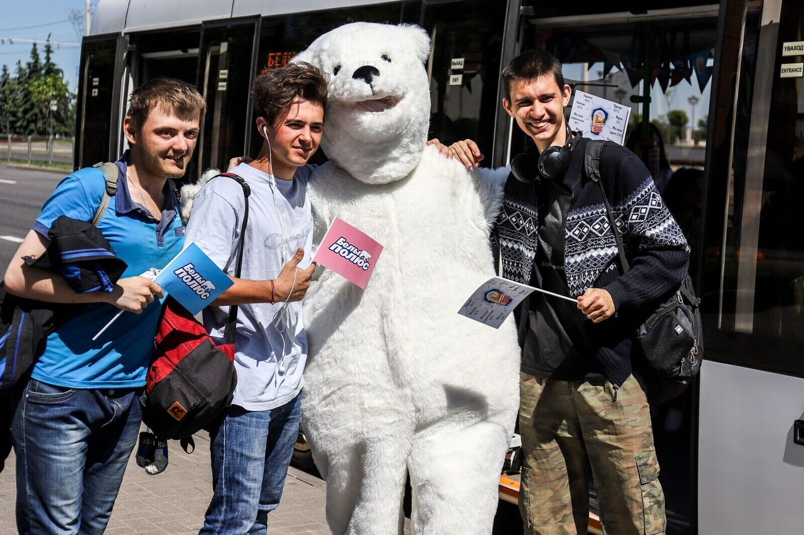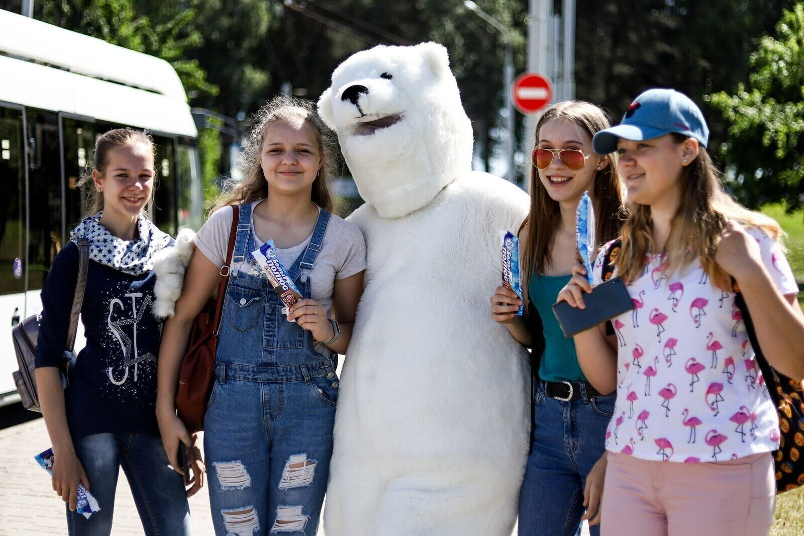 Каждый час с 10:00 до 17:00 по маршруту №1 курсировал специальный рейс «Белого Полюса», а пассажиров на входе встречал белый медведь с праздничными флажками. Получить мороженое было не так просто — нужно было назвать состав мороженого без Е-добавок. Предлагаем вам посмотреть, кто же все-таки получил заветный пломбир.