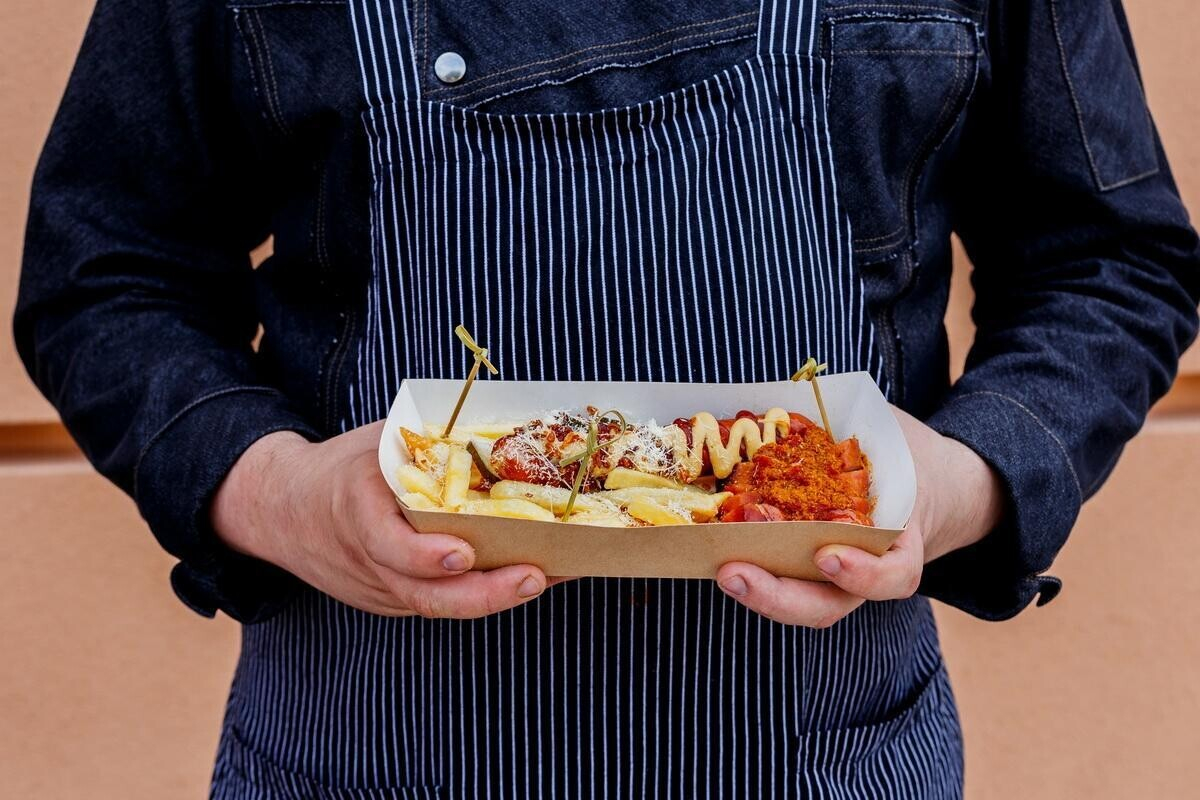 Карривурст (колбаса гриль с соусом на основе цельных томатов с добавлением карри мадрас), колбаска с томатным соусом на копченой паприке и мягкой горчице, картофель фри, лук фри, крошка из твердого сыра, маринованные огурчики.