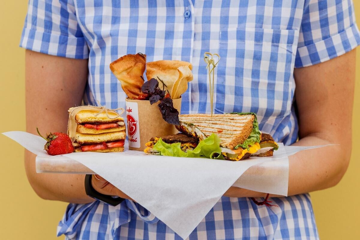 Сэндвич с ярким вкусом копченой курочки, сыром чеддер, маринованным луком, соленым огурцом и фирменным соусoм, салат «Нут с баклажаном», «Сладкий сэндвич» (нежное сочетание клубники, банана и шоколадной пасты).