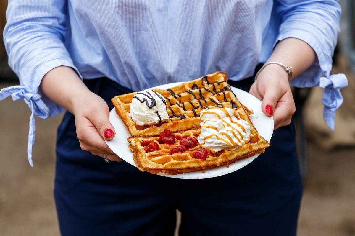 Бельгийская вафля с шариком мороженого и шоколадным топпингом, бельгийская вафля со взбитыми сливками и малиной.