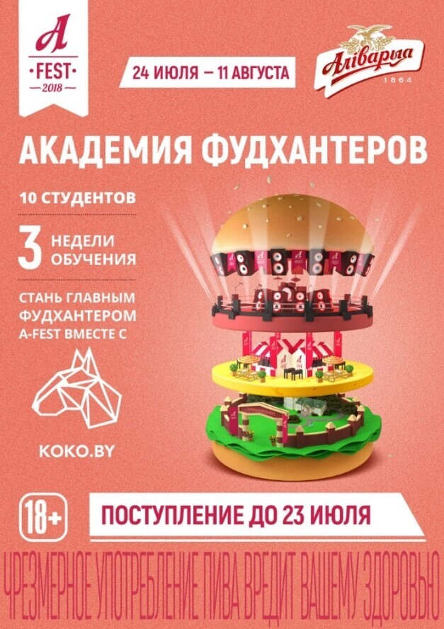 В Академию фудхантеров A-Fest обещают зачислить 10 «студентов». Попасть в нее может каждый: нужно сделать пост в Instagram с обзором на свое любимое блюдо, отметив при этом профили @koko.by, @alivariabelarus и написав хештег #афэст2018. Обзоры принимаются до 23 июля.