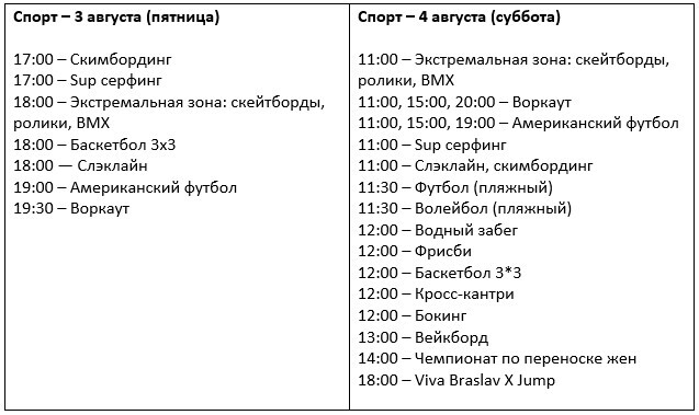 Обширная спортивная программа — одна из визитных карточек Viva Braslav Open Air. В этом году зрители увидят соревнования по пляжному футболу, волейболу, баскетболу 3х3 и вейкбордингу, шоу-программы и мастер-классы по скейтбордингу, американскому футболу, слэклайну, хайлайну, воркауту. А также смогут посмотреть чемпионат по переноске жен, забег «Пивная миля» и «Забег по воде».