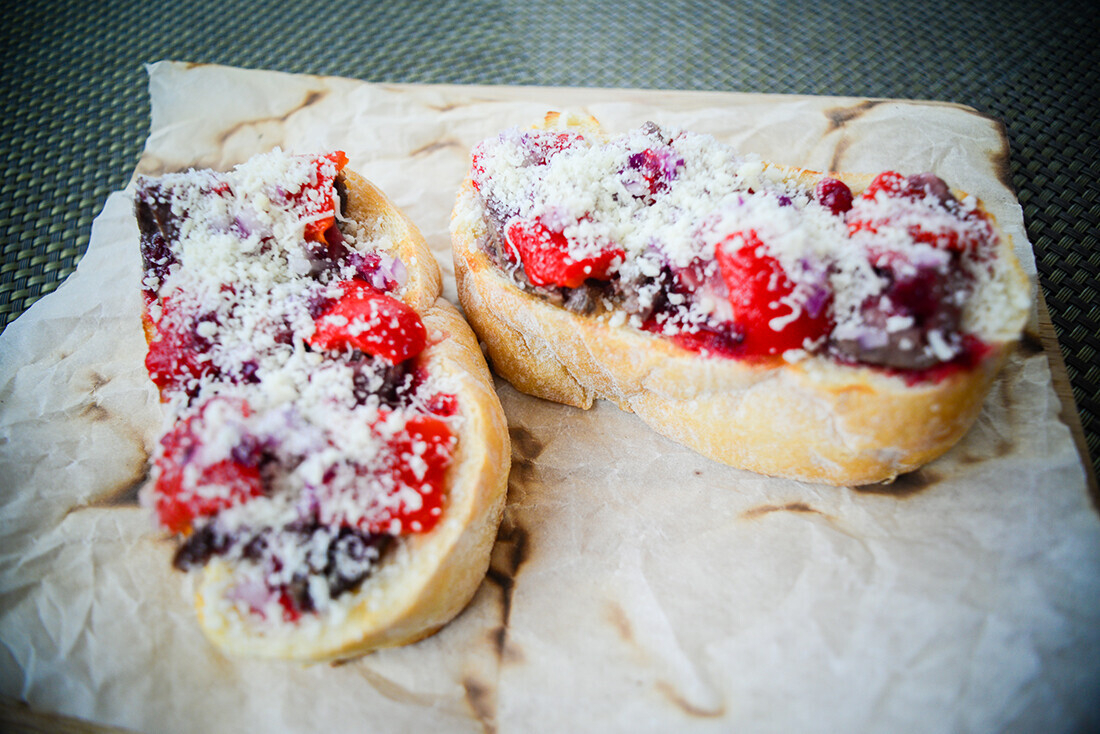 Брускетта с ростбифом и клюквенным конфи