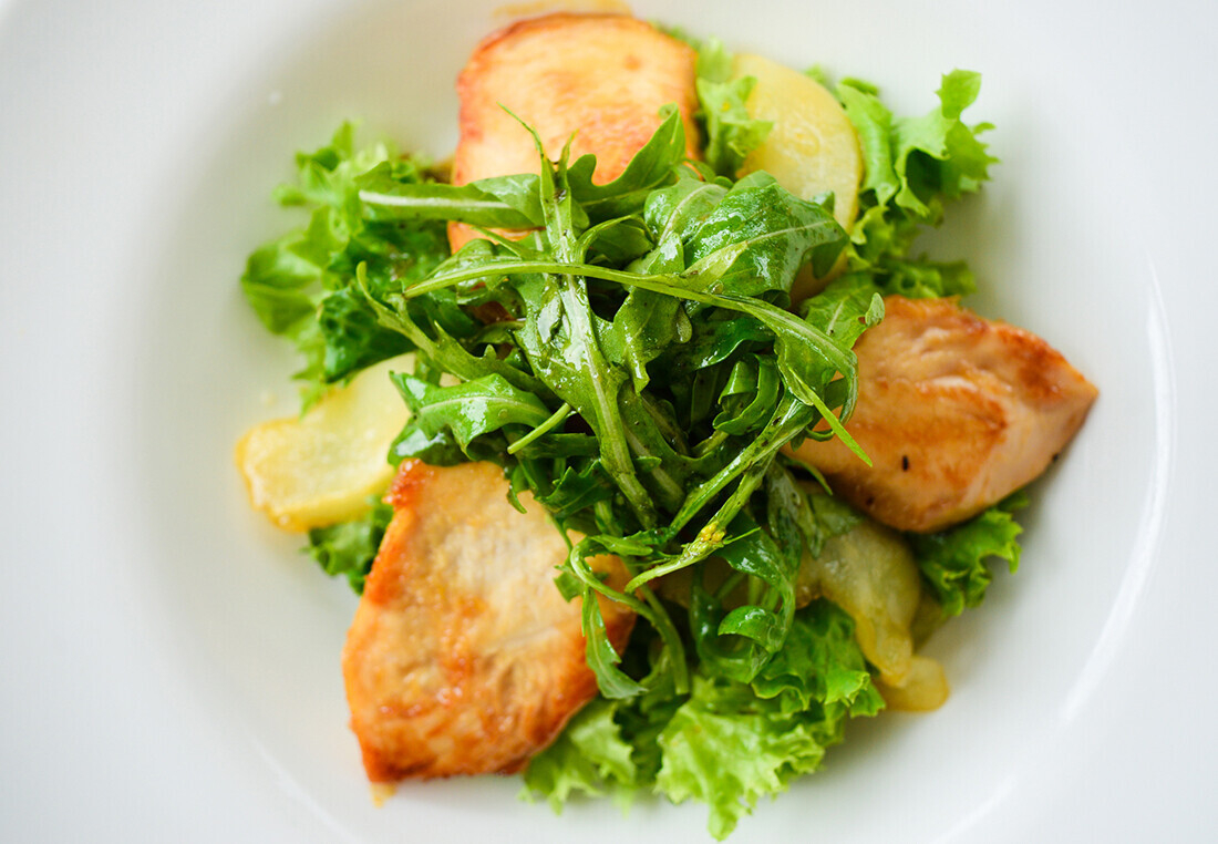 Теплый салат с цыпленком и карамелизированной грушей