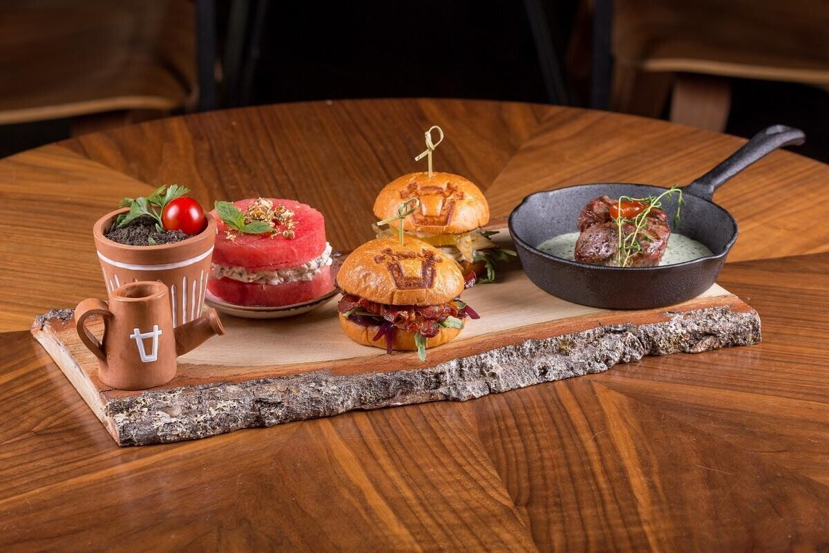 Бургер Don Pablo, соба с говядиной и пряным соусом, арбуз с рикоттой.