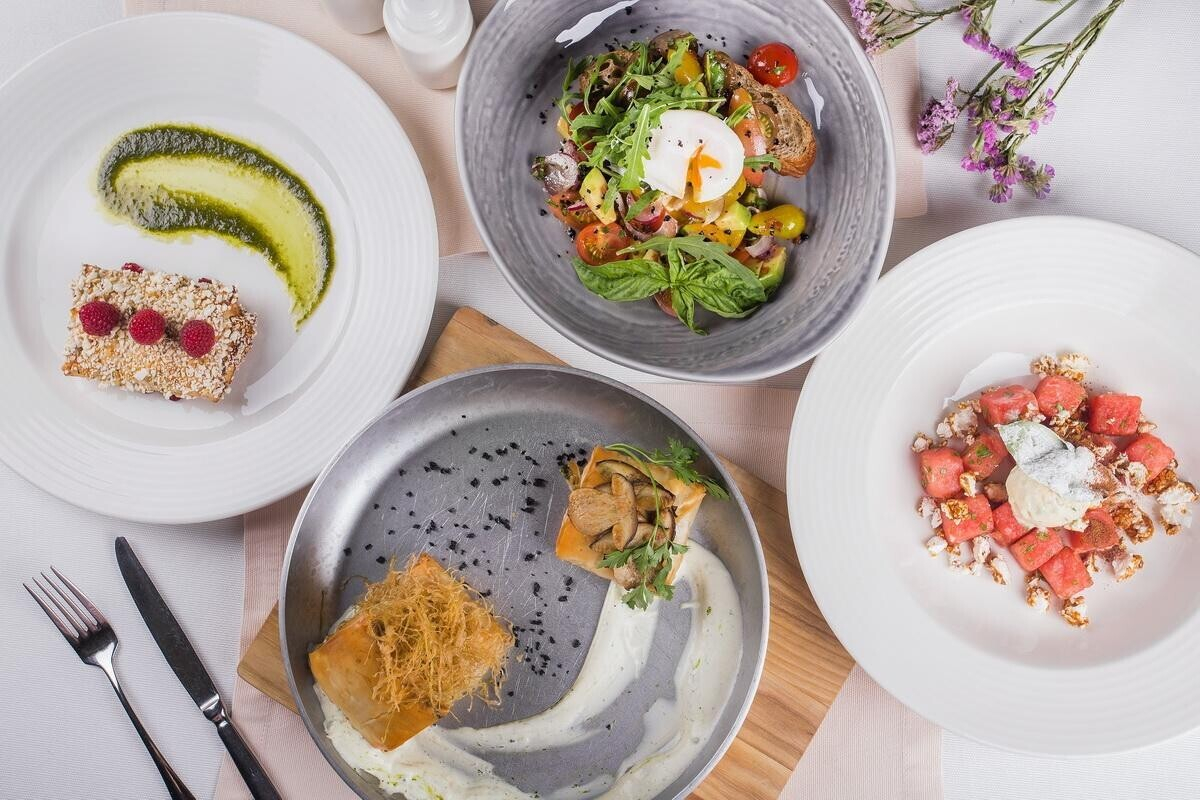 Закуска из томатов и авокадо с яйцом пашот, мини-пирог с уткой и печеным перцем, «Совсем не ленивые голубцы» от Шефа, базиликовое мороженое с маринованным арбузом.