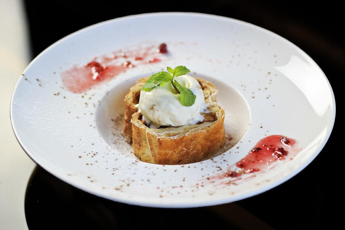 Салат с персиком и беконом, стейк из свинины в фирменном соусе из каракатицы на подушке из шпината с молодым картофелем, яблочный штрудель с мороженым.