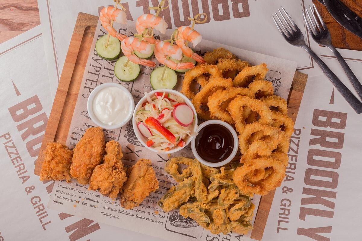 Куриные крылышки Kentucky, хрустящие кольца из кальмара в панировке, панко «Перчики халапеньо», королевские креветки, летний салат, сливочно-чесночный соус, соус на выбор.