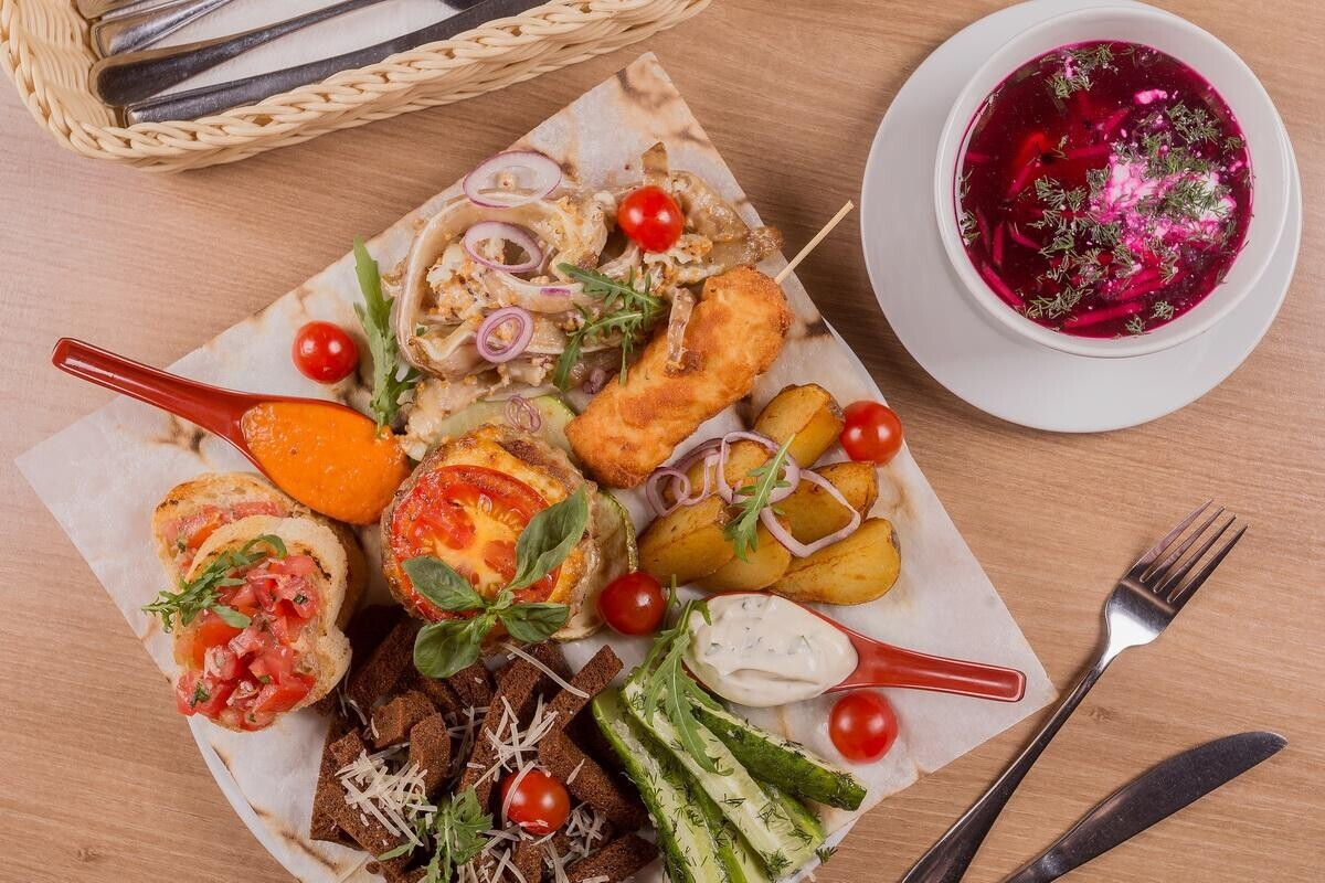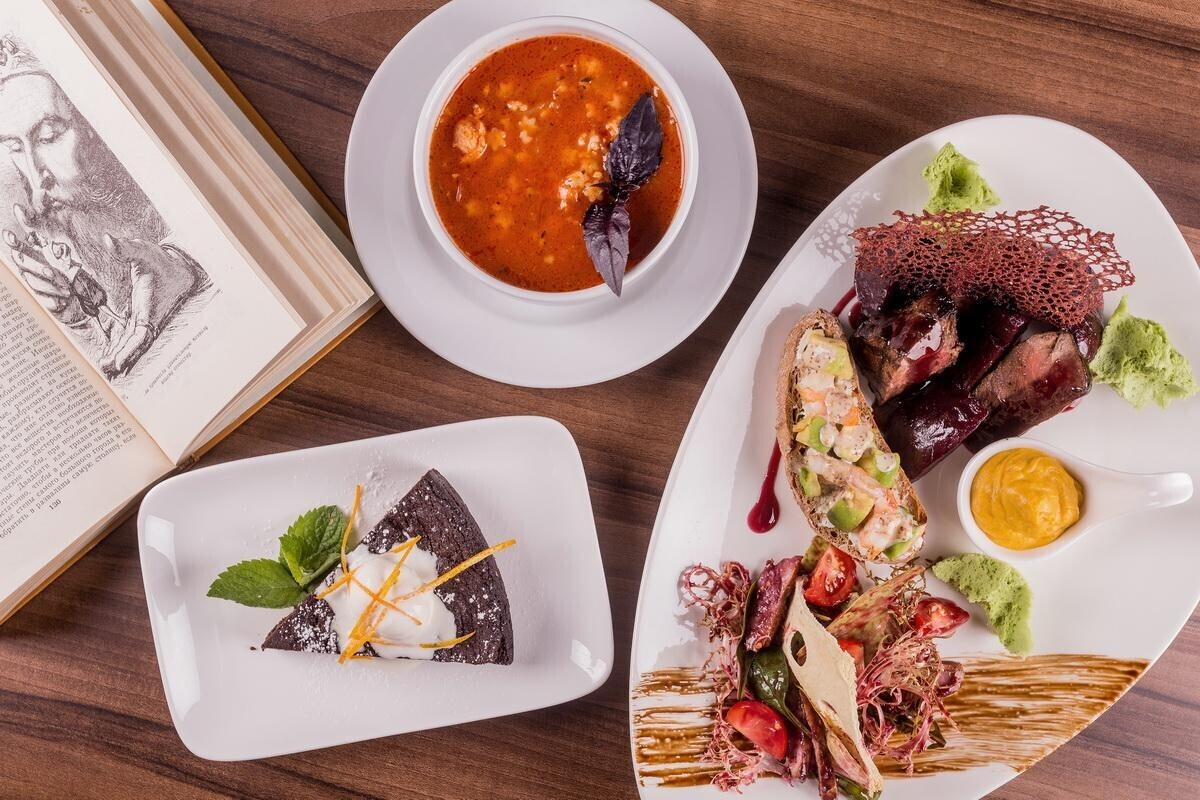 Салат из нежного филе птицы под малиновым соусом, брускетта с креветкой и авокадо, дип из моркови с сельдереем, суп Фидеус Стейк из говядины под винным соусом со свеклой на гриле, торт шоколадно-апельсиновый с мороженым.