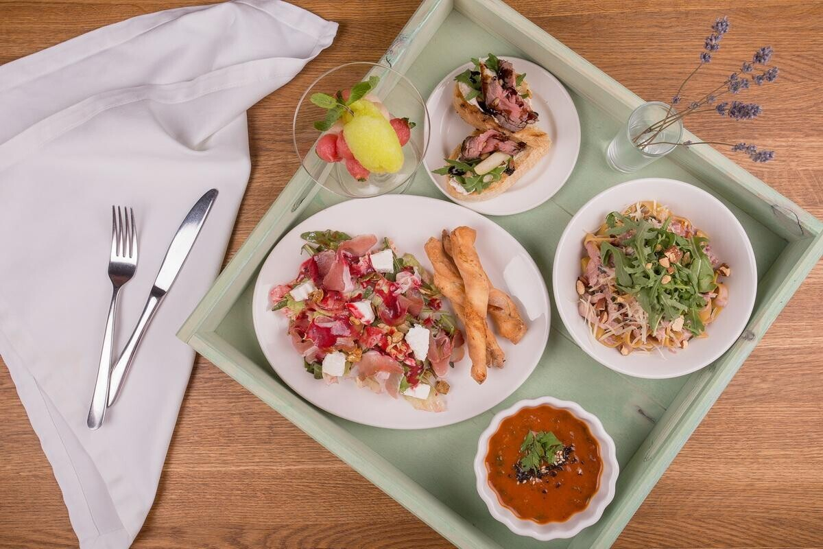Брускетта с ростбифом и грушей, салат с пармой и мятно-малиновым соусом, имбирно-томатный суп, сырные гриссини, миндально-ежевичная паста с курицей, десерт из дыни и арбуза с лаймовым сорбетом.