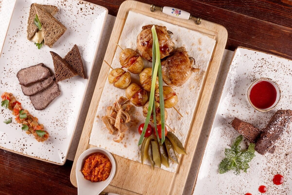 Ростбиф из говядины, паштет из куриной печени с гренками, икра из баклажанов, бедрышки цыплят, шашлычки из картофеля с беконом «Копченые ушки».