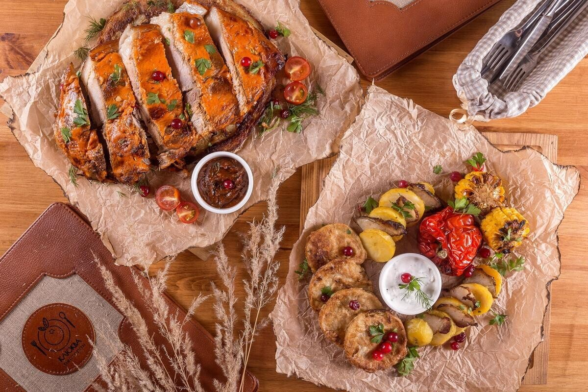 Свинина, запеченная под соусом, кукурузный початок, кабачки, жаренные в кляре, картофель по-деревенски запеченный, перец болгарский печеный, томаты черри, соус сметанный, аджика.