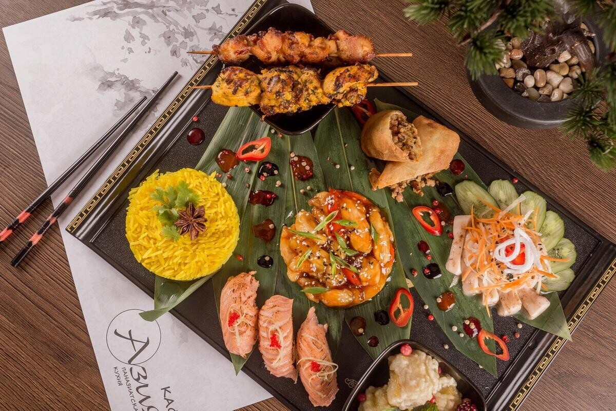 Рассыпчатый рис с куркумой, тикка масала из курицы (шашлычок), сате аям (шашлычок), салат Фукушима, хрустящий фаршированный блинчик по-шанхайски, абури саамон (нигири из лосося), хрустящая курочка в медовом соусе, бананы, жареные в кокосовой стружке (десерт), соус Кунь По.