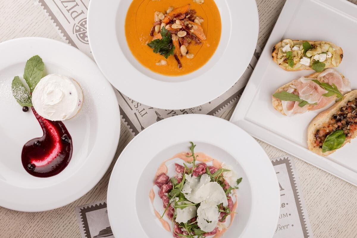 Трио брускетт, суп из белой фасоли и томатов, свекольные ньокки с рукколой и козьим сыром, мороженое из рикотты с черной смородиной.