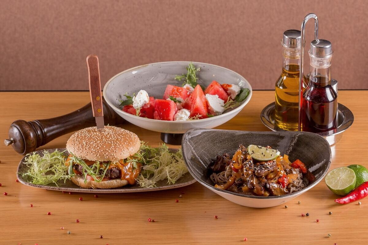 Бургер Don Pablo, соба с говядиной и пряным соусом, арбуз с рикоттой.