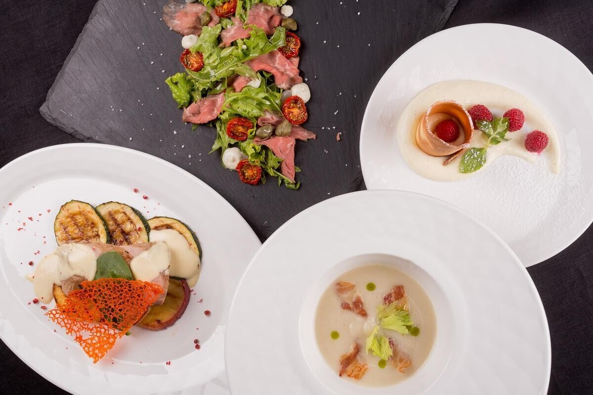 Салат с ростбифом, рукколой, луком-шалот и соусом, Дор Блю Крем-суп, свинина су-вид, каталонский крем с ванилью и свежей малиной