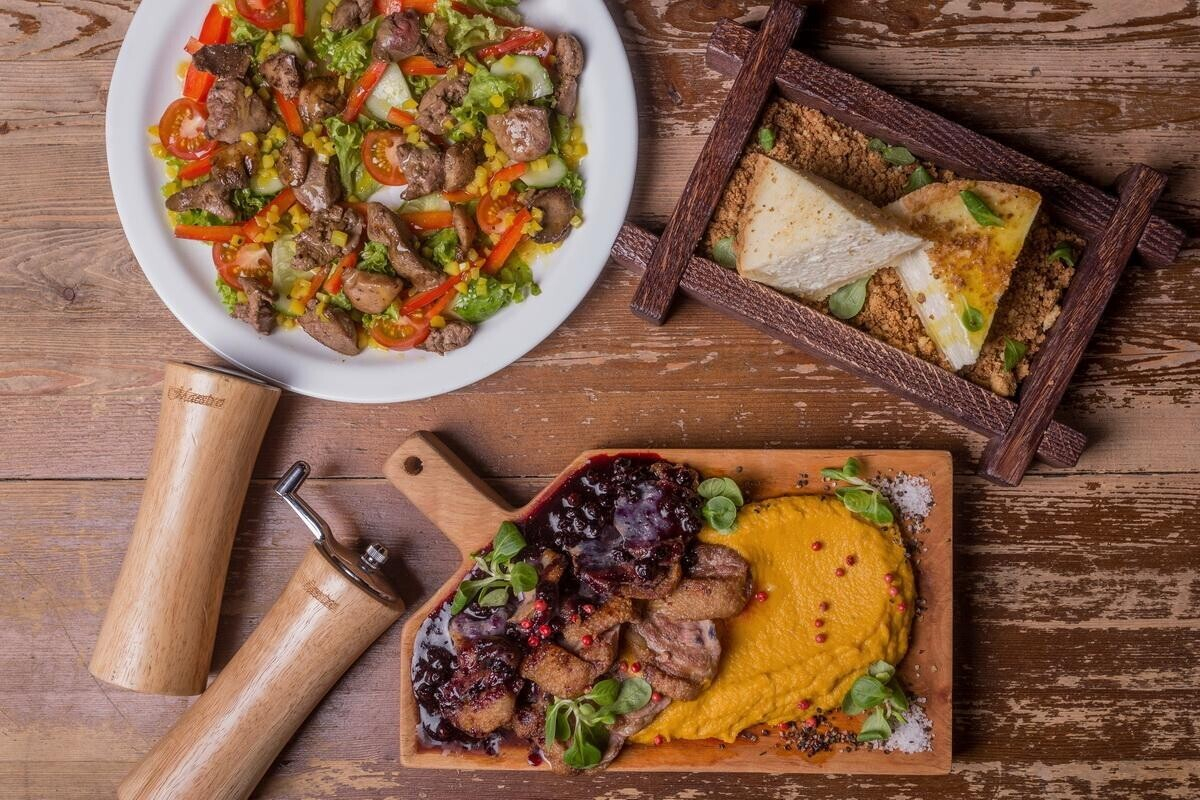 Салат с куриной печенью и грушевым чатни, утиное филе с тыквенно-морковным пюре и можжевеловым соусом, домашний чизкейк с гелем из подсоленной лимонной карамели (подается с ореховым крамблом)