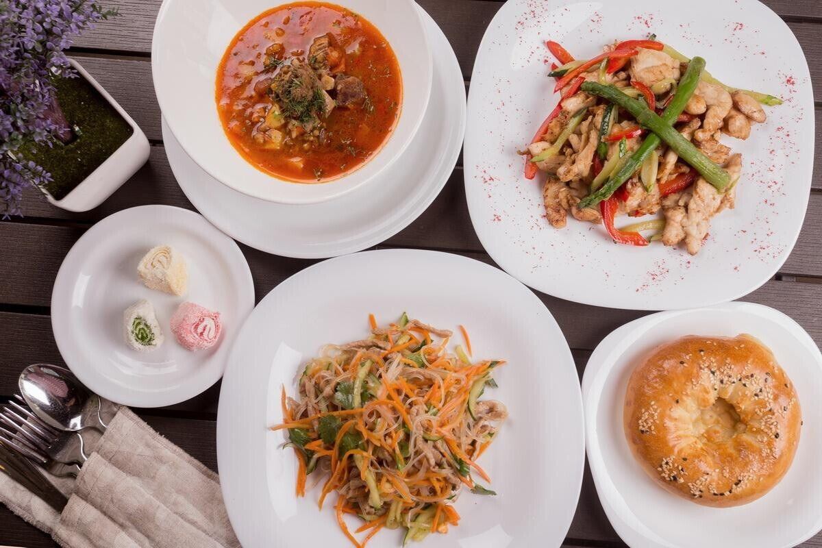 Восточный суп «Мостава», салат «Фунчеза» с рисовой лапшой, «Товус» (куриное филе, томленое с овощами с добавлением восточных специй), лепешка узбекская, восточные сладости «Рахат-Лукум».