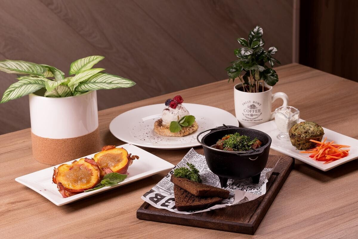 Персик с луковым джемом, запеченный в беконе, говядина, томленая в вине с лесными грибами, маффин с куриной печенью, овощами и соусом цацики, муравейник с ванильным мороженым