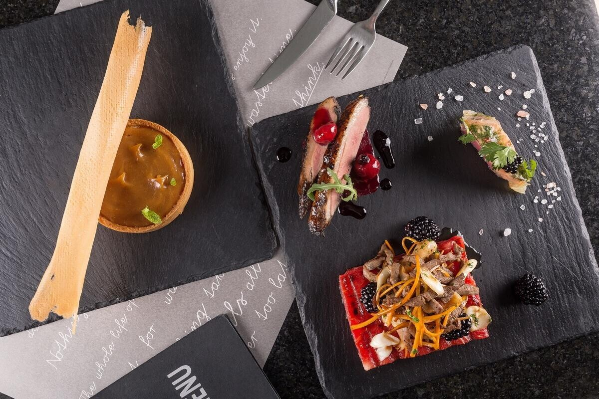 Террин из трех видов рыбы, утиное филе-гриль на подкопченной свекле с вишней, арбуз на гриле с тайским салатом, ванильный флан с соленой карамелью.