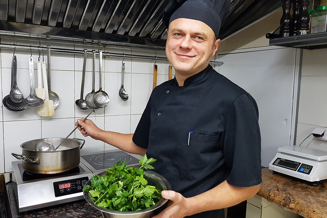 Когда-то Вячеслав Федюк мог стать плотником. Но любовь к кулинарии победила. Сегодня шеф-повар успел поработать с испанской, болгарский, немецкой, белорусской и европейской кухнями и уже несколько лет создает авторские блюда для кафе «Коммуналка».