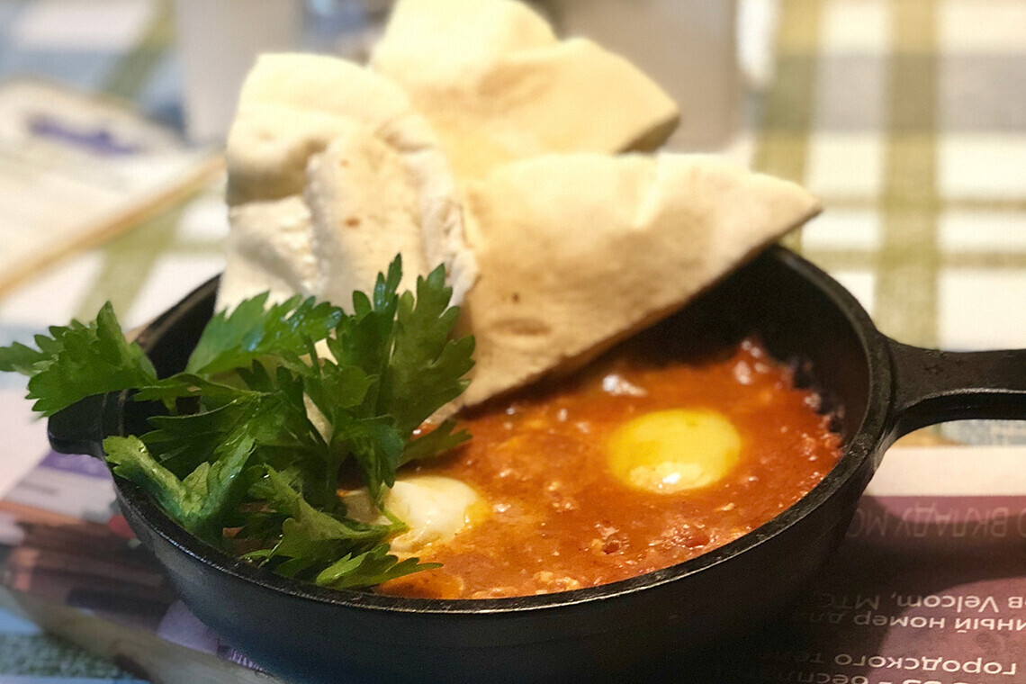Описание: шакшука — это прекрасное начало дня в любое время года. Блюдо подается в порционной сковороде со свежей лепешкой. Но ни в коем случае не стоит называть шакшуку яичницей.
