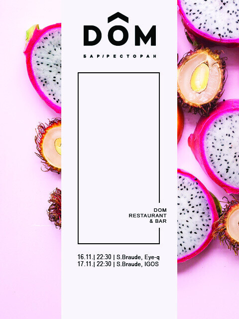 Любителей вкусной еды и спокойной атмосферы домашнего уюта ресторан ДОМ радует живым исполнением фортепианной музыки от Сергея Брауде и вечерними Dj сетами от Eye-q и IGOS.