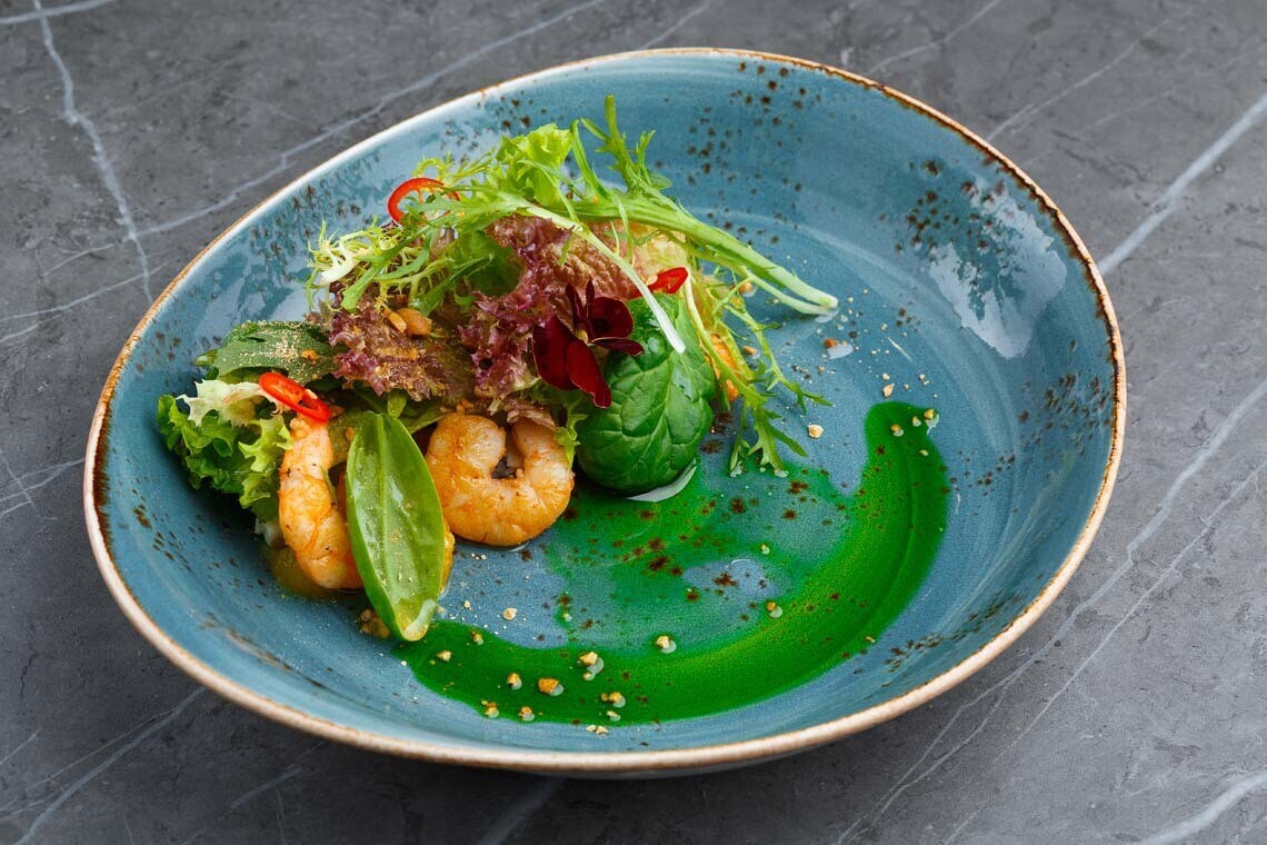 Салат с тигровыми креветками, апельсиновым пюре и голубым сыром.