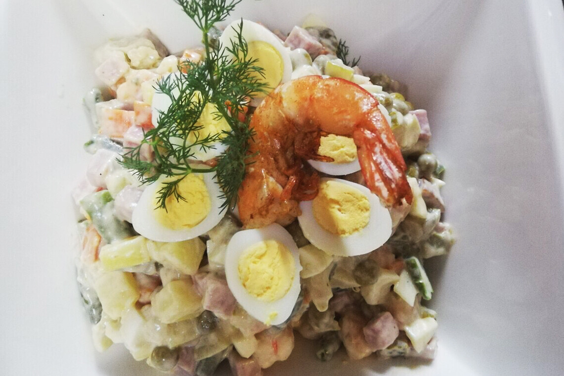 Салат «Оливье» с тигровыми креветками — 220/20/15/2/10,50 BYN