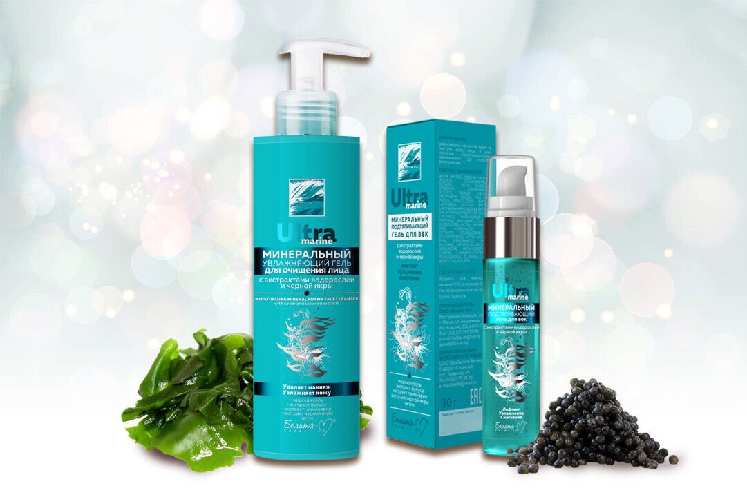- Минеральный увлажняющий гель для очищения лица с экстрактами водорослей и черной икры;