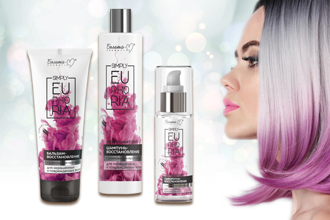 Средства серии Simply EUPHORIA представляют протеиновую программу глубокого восстановления окрашенных и поврежденных волос на основе комплекса растительных протеинов: ультрамягкий бессульфатный шампунь бережно очищает, не пересушивая волосы и кожу головы, бальзам-восстановление интенсивно питает, увлажняет и восстанавливает волосы по всей длине, несмываемая сыворотка для секущихся кончиков придает глянцевый блеск и шелковую гладкость, защищая волосы от негативного действия мороза, ветра и сухого воздуха.