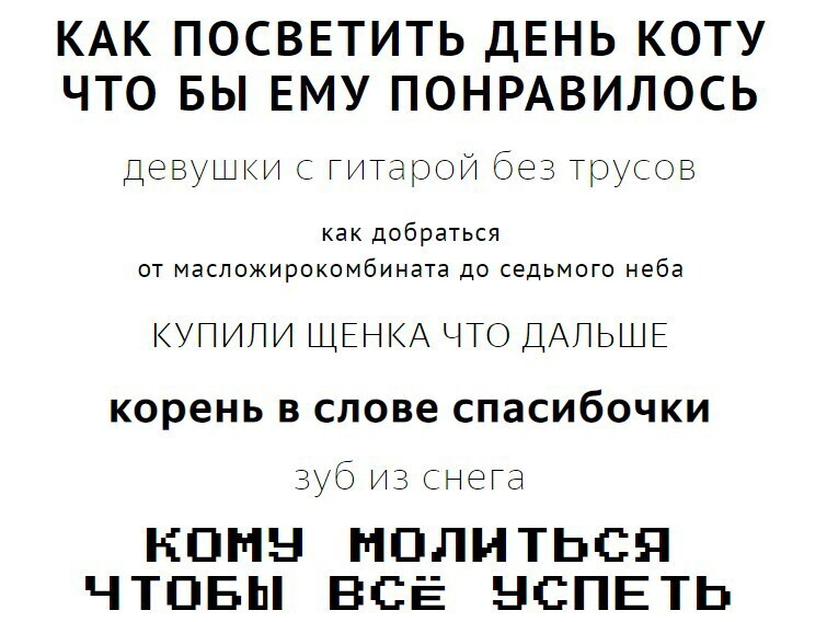 — Мы достали из черновиков и блокнотов любимые запросы, добавили просто хороших и добрых, сложили всё в один мешок и перемешали. Получился генератор предсказаний — жмете на кнопку, получаете текст и думаете, к чему бы это. Все запросы приводятся в том виде, в каком были заданы, — рассказывают в компании.