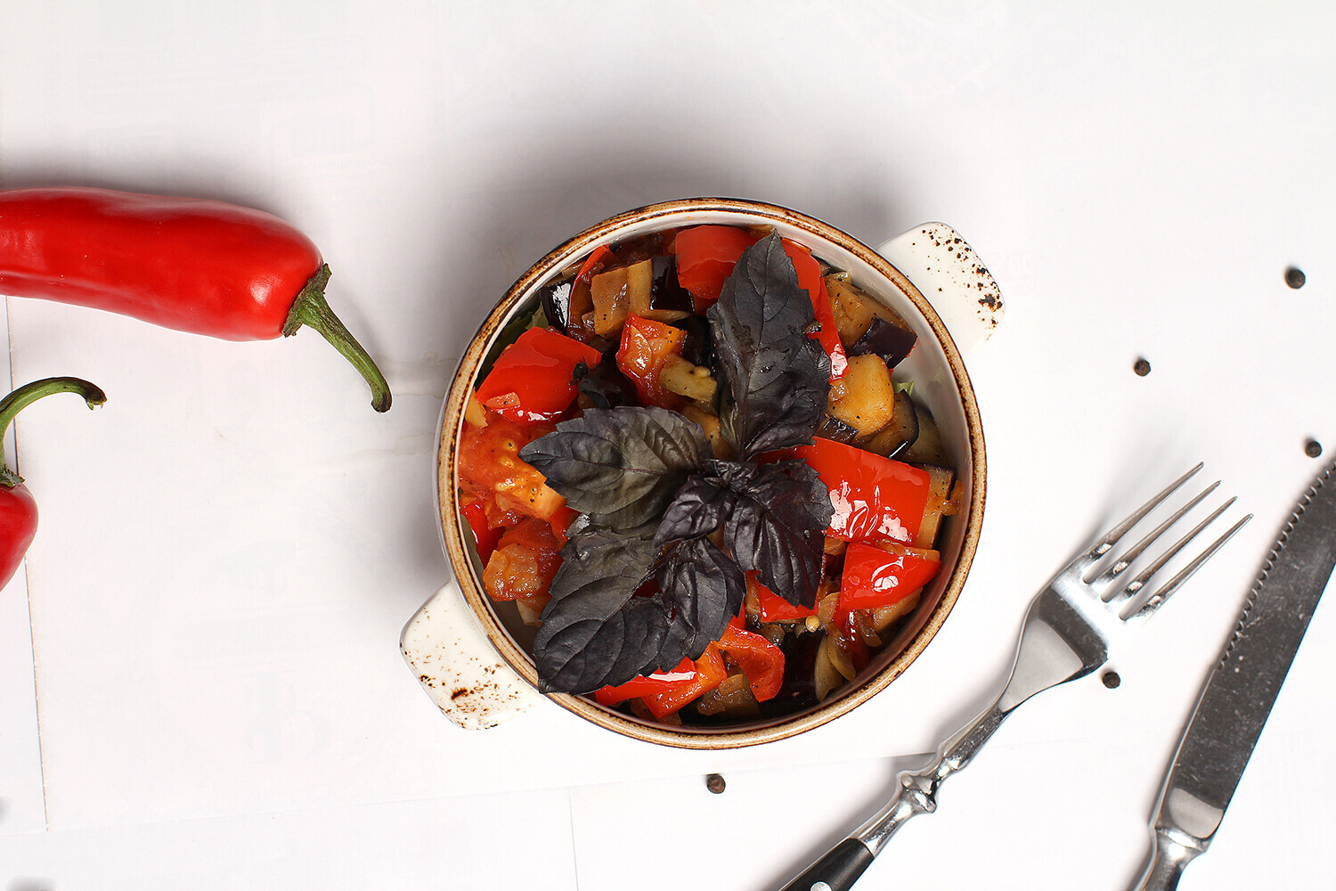 Описание: кавказское овощное рагу из тушеных баклажанов, сладкого перца, помидоров и лука, щедро сдобренных пряными травами, зеленью и чесноком