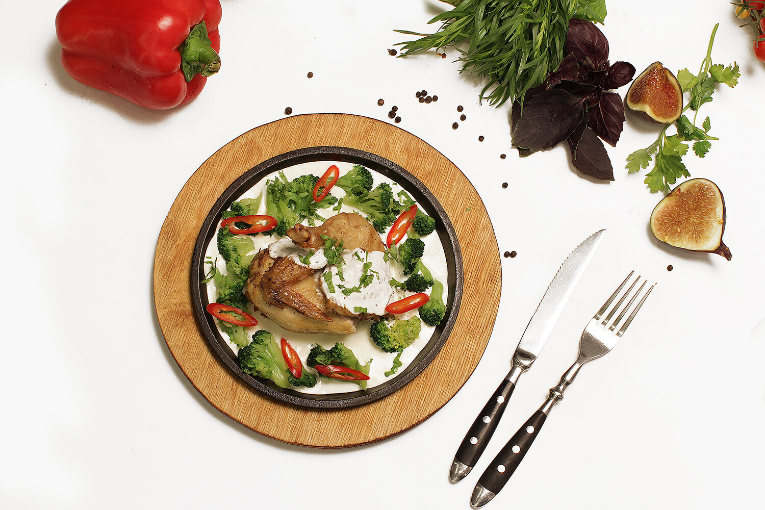 Описание: цыпленок в сливочно-чесночном соусе с брокколи и жгучим перцем Чили