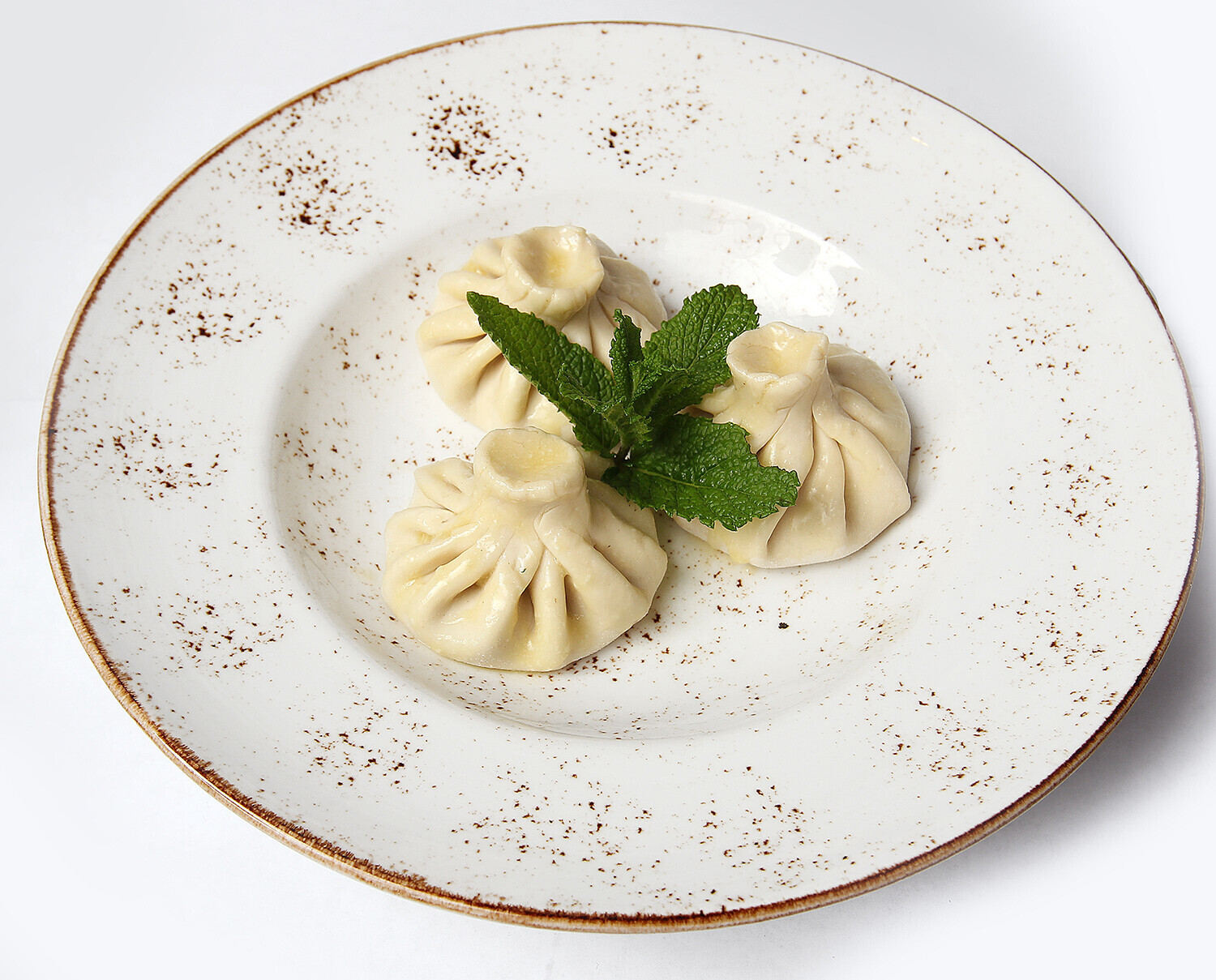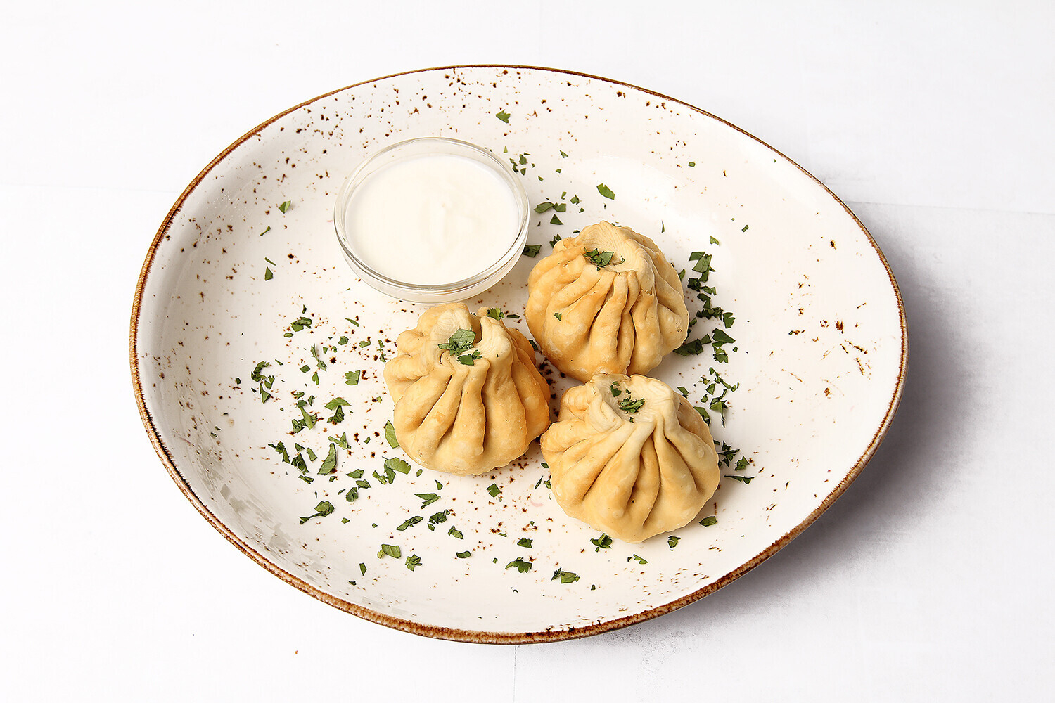 Описание: хинкали в азиатском стиле из свинины и говядины с кинзой, специями и пикантным соусом