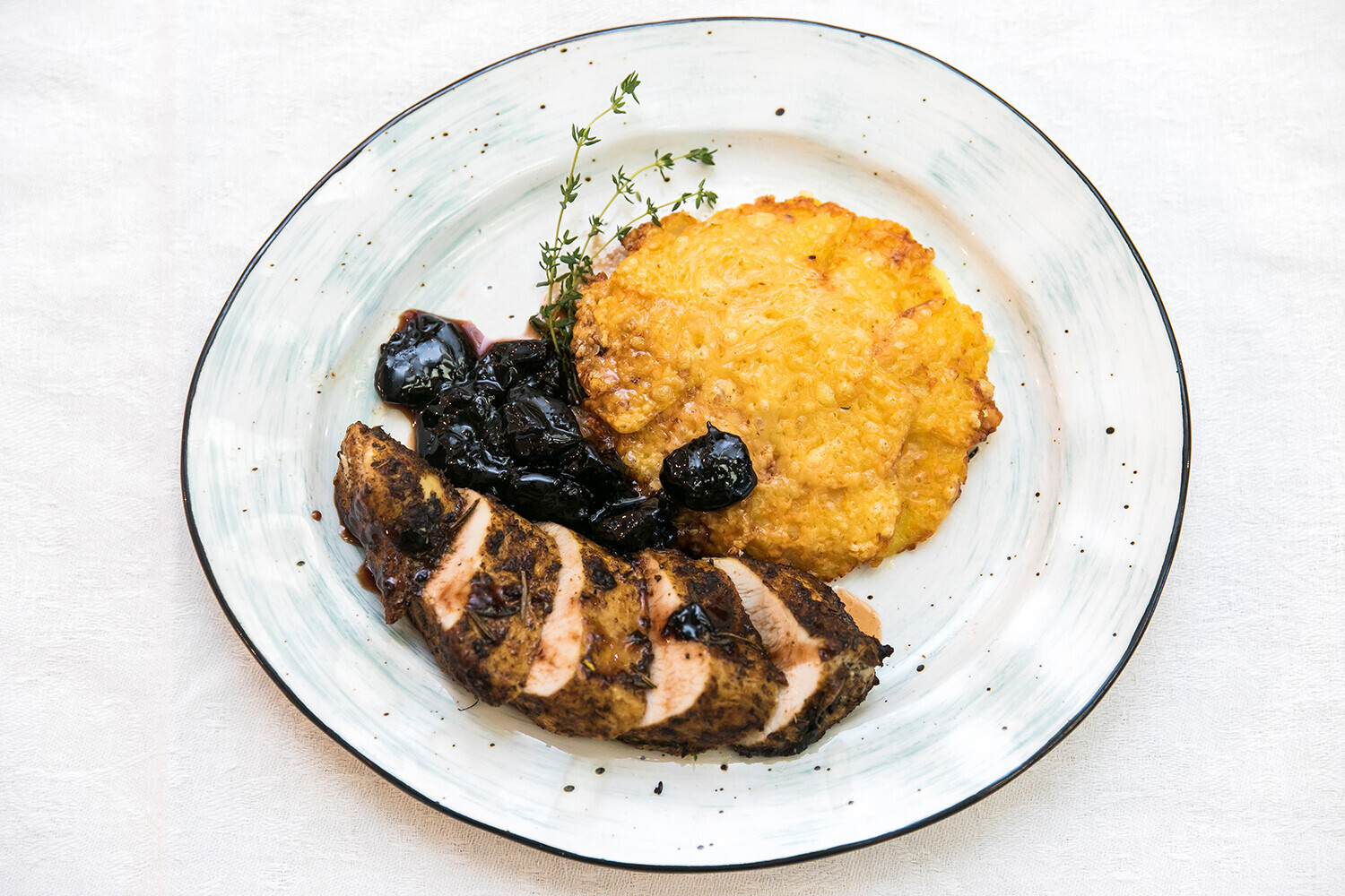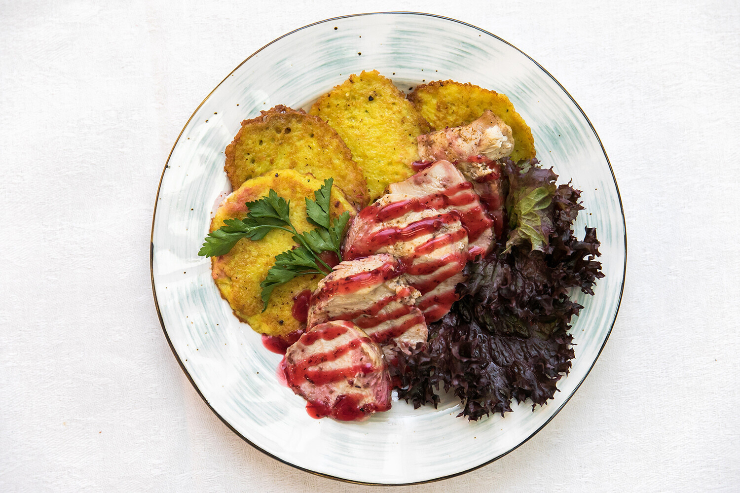 Куриное филе, обжаренное со специями, на тыквенных оладьях