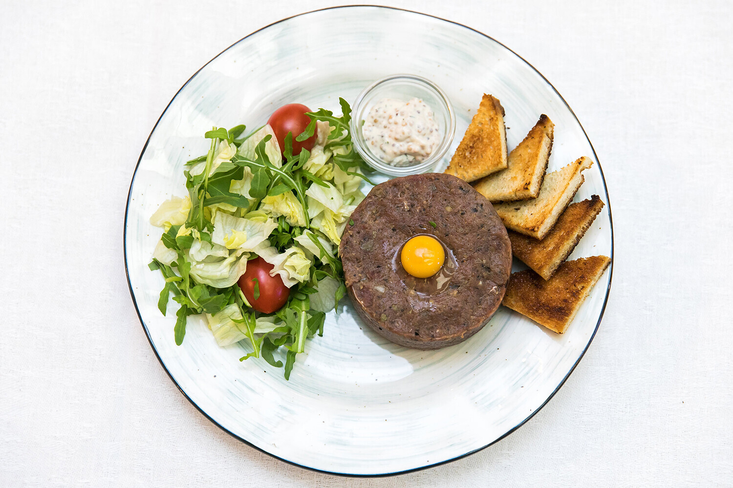 Тартар из говядины с микс-салатом и пикантной заправкой