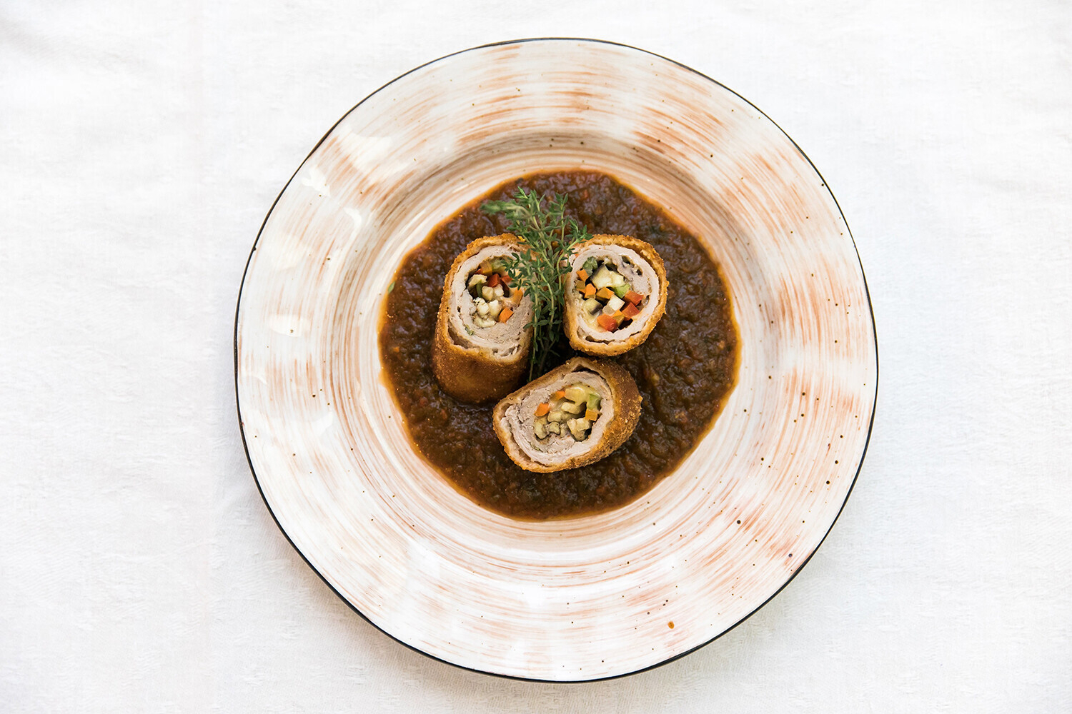 Свиные рулетики с сельдереем, морковью, сыром и овощной икрой