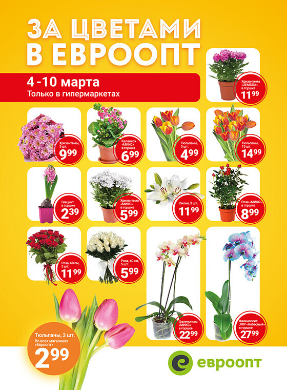 *С 4 по 10 марта тюльпаны можно будет приобрести во всех магазинах сети «Евроопт»; хризантемы, розы, лилии — только в гипермаркетах.
