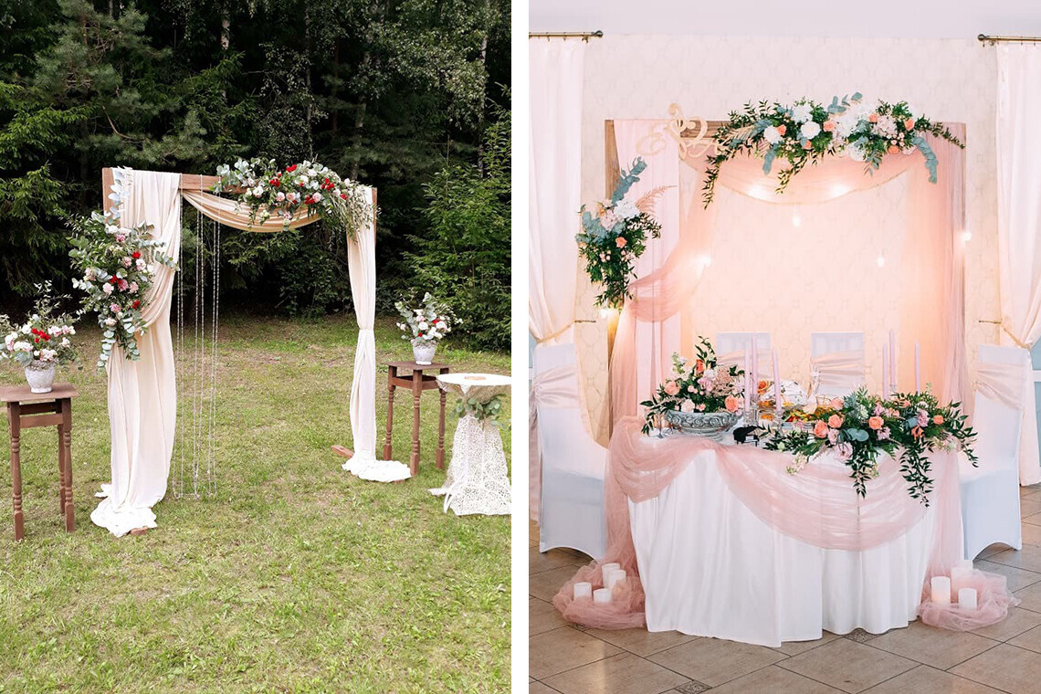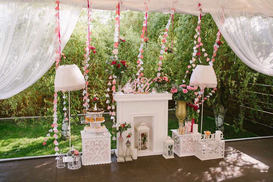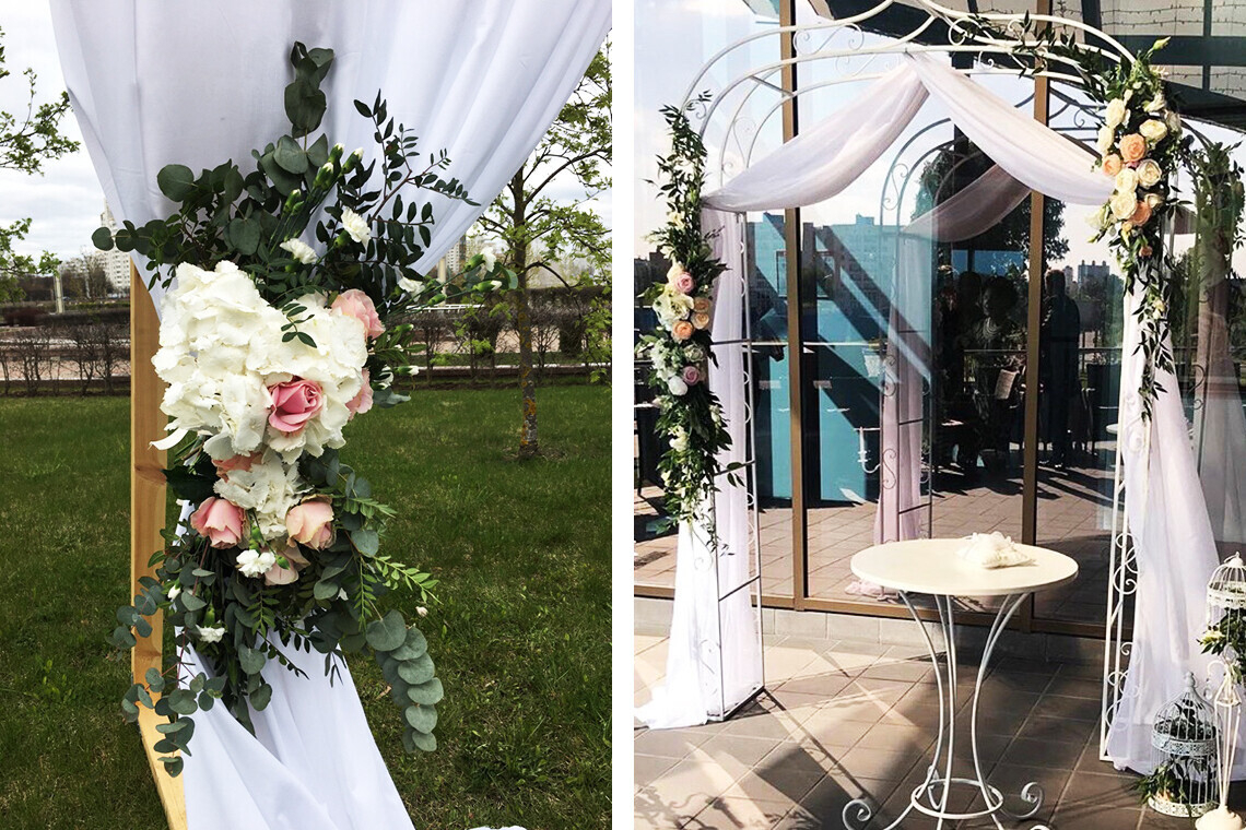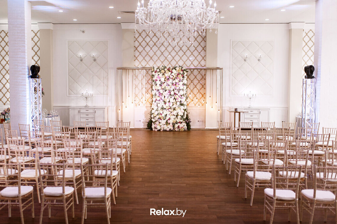 При желании вам всегда помогут с оформлением. Юбки на столы и чехлы на стулья предоставляются бесплатно при количестве гостей от 40 человек. Украшение зоны молодых и столика для дарения обойдется в 180 BYN.