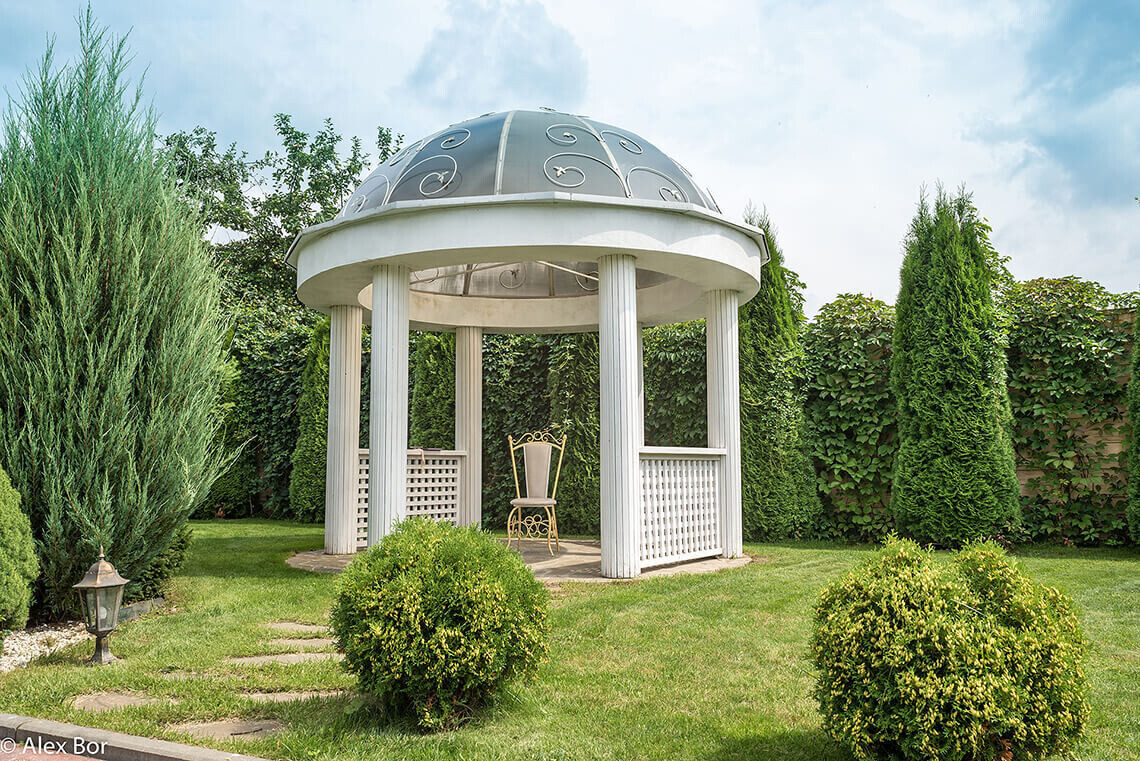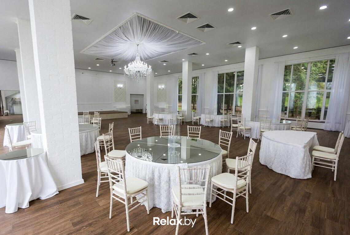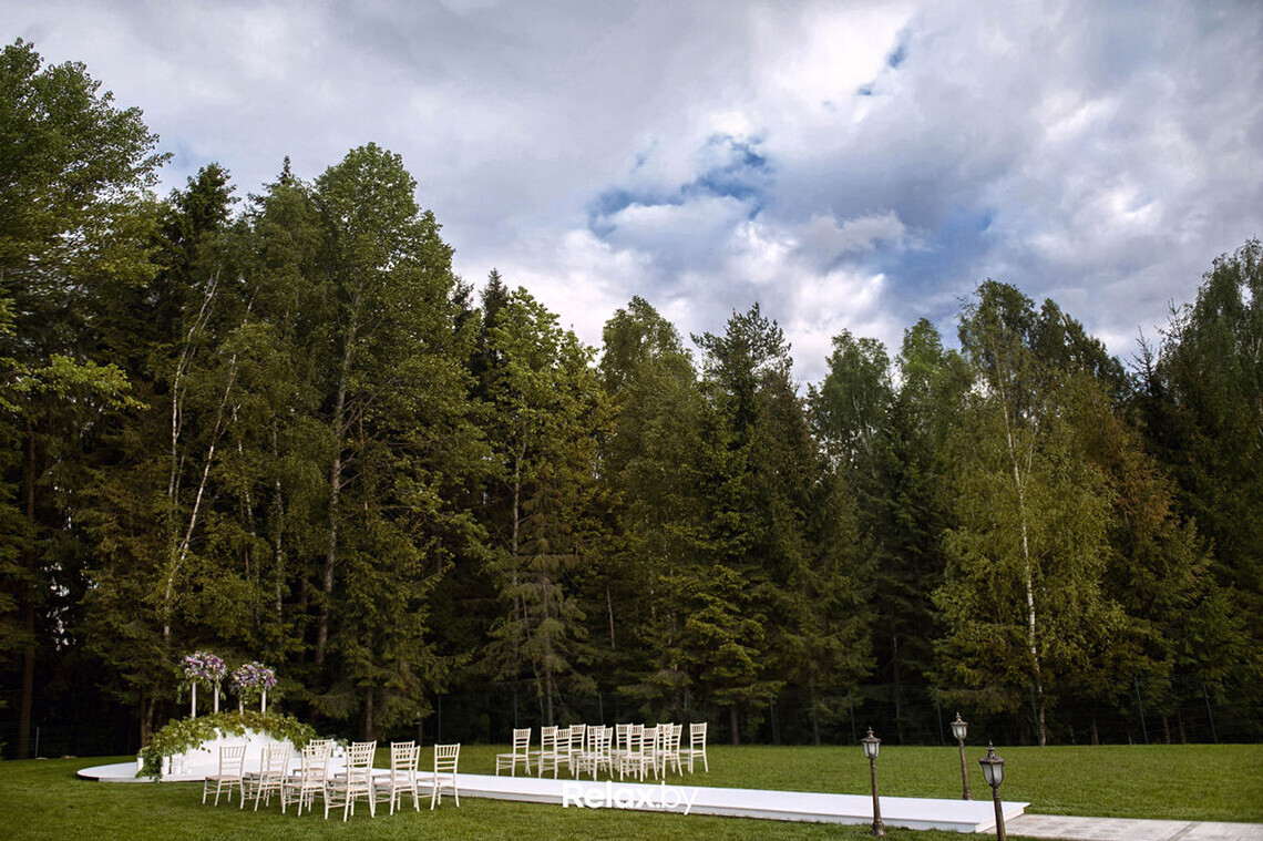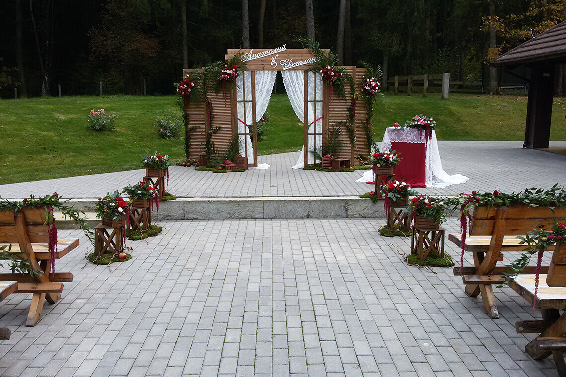 Для проведения торжества сдается полностью вся усадьба с прилегающей территорией. Банкетная беседка вмещает до 50 человек, отдельно предусмотрена танцевальная площадка. Также есть возможность организовать свадьбу в шатре, который с комфортом разместит до 70 гостей.