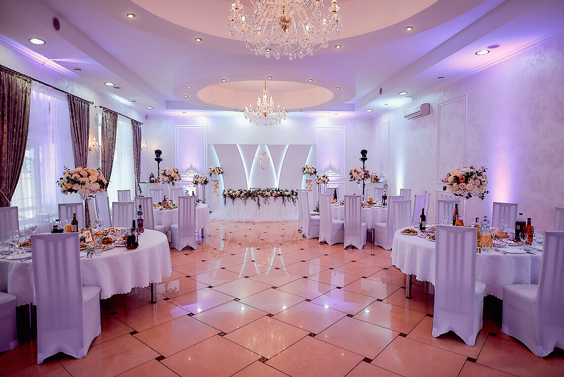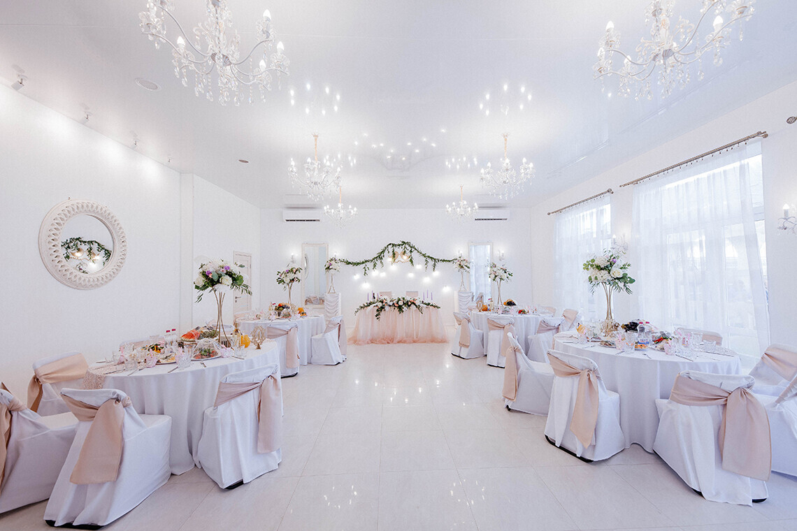 Банкетная служба отеля предоставляет базовый свадебный декор: скатерти, чехлы на стулья, сервировку. Дополнительный декор, флористика, свет и звук могут быть подобраны с помощью свадебных организаторов с учетом формата и концепции мероприятия.