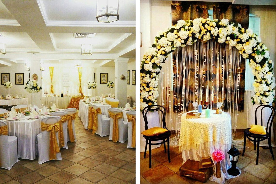 К услугам гостей — три зала ресторана, отель и большая бесплатная парковка. Основной зал «Вилла Рада» рассчитан на 110 человек, банкетный с комфортом разместит до 50 гостей, а VIP-зал — до 14. Кроме этого, у ресторана имеется летняя терраса, детская площадка, большая территория в лесном массиве с площадкой для выездной регистрации. Кстати, при желании, в «Вилла Рада» опытный декоратор всегда поможет вам с украшением места для торжества.
