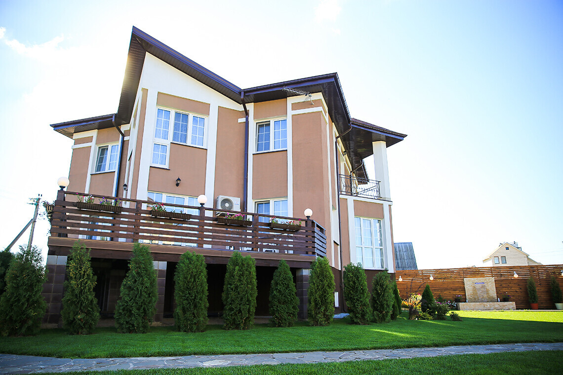 Коттедж Gold расположен в 5 км от МКАД по Брестскому шоссе М1 на берегу водохранилища Птичь и готов принять до 200 гостей.