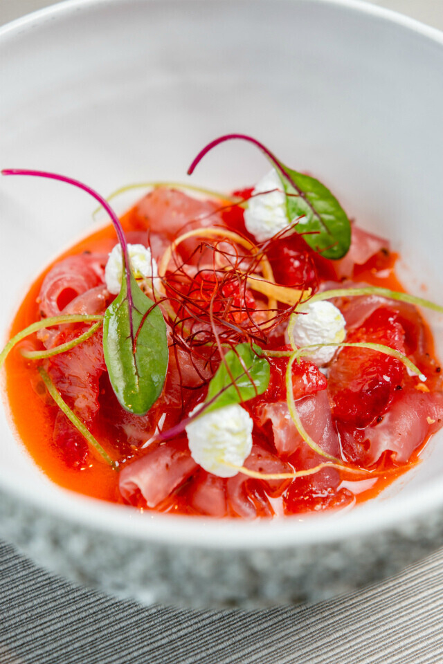 Весенний фитнес-стартер для ценителей легкости — севиче из свежего тунца из Шри-Ланки. Тонкие слайсы филе подаются с мякотью красных апельсинов и лимонным «Шантили», а также морковно-имбирным фрешем, который добавляют в севиче при презентации блюда гостю. Взбитые сливки в составе крема помогают морковному соку правильно усваиваться организмом, поэтому блюдо можно смело считать витаминной бомбой нового меню.