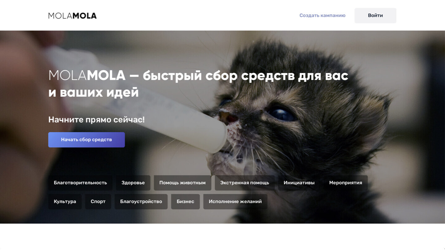 MolaMola — это сервис, позволяющий человеку быстро найти деньги для разных целей: от подарков и праздников до сложных жизненных обстоятельств, например, несчастных случаев или болезней. Финансирование таких кампаний — безвозмездное.