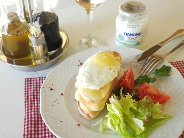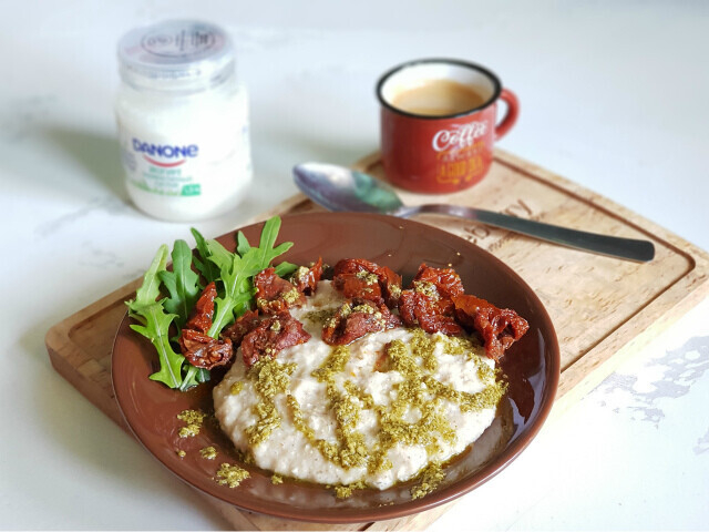 - Яичница-глазунья с семгой домашнего посола с соусом «Песто»